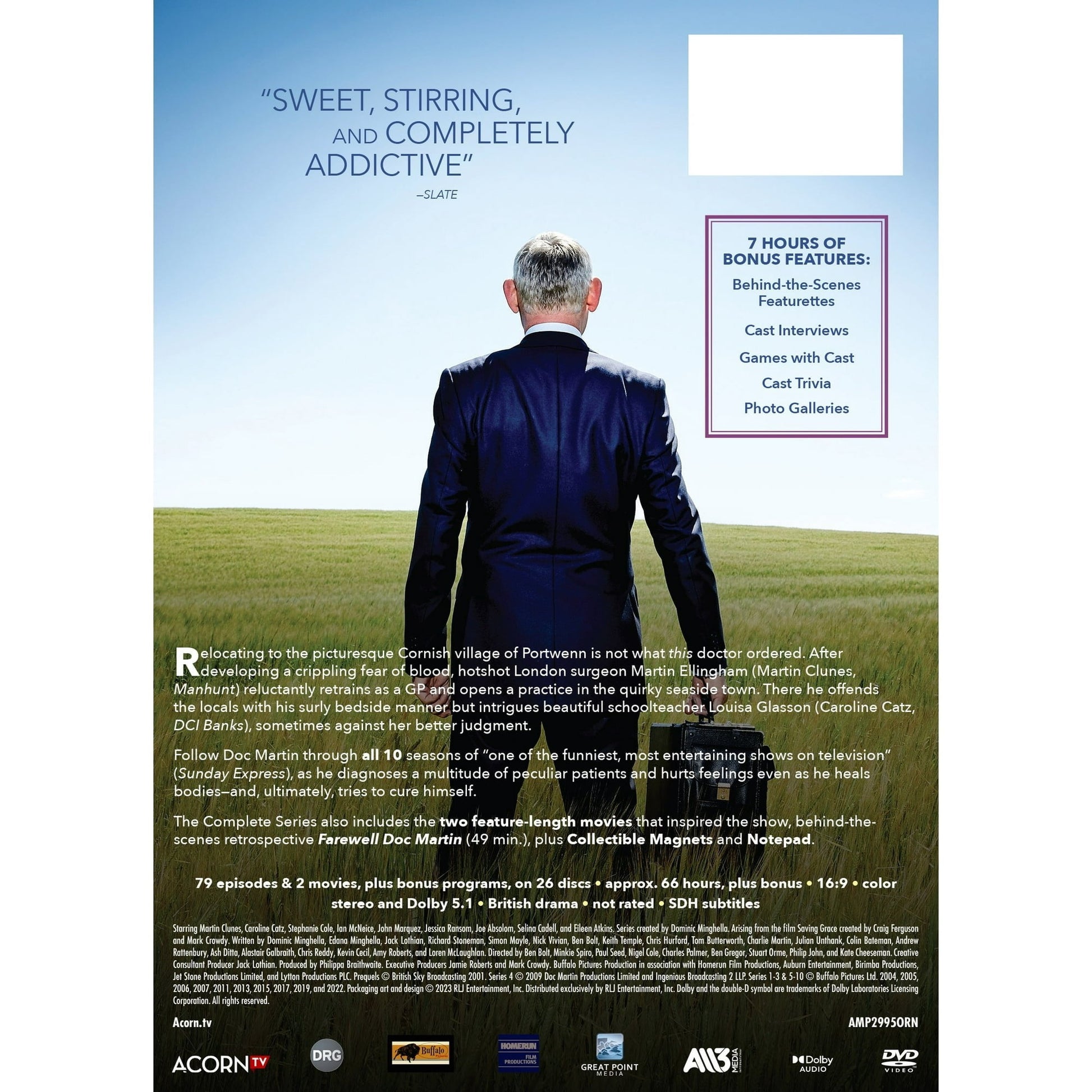 Product detailsSweet, stirring, and completely addictive¡± ¡ªSlateRelocating to the picturesque Cornish village of Portwenn is not what this doctor ordered. After developing a crippling fear of blood, hotshot London surgeon Martin Ellingham (Martin Clunes, Manhunt) reluctantly retrains as a GP and opens a practice in the quirky seaside town. There he offends the locals with his surly bedside manner but intrigues beautiful schoolteacher Louisa Glasson (Caroline Catz, DCI Banks), sometimes against her better judgment.Follow Doc Martin through all 10 seasons of ¡°one of the funniest, most entertaining shows on television¡± (Sunday Express), as he diagnoses a multitude of peculiar patients and hurts feelings even as he heals bodies¡ªand, ultimately, tries to cure himself.The Complete Series also includes the two feature-length movies that inspired the show, behind-the-scenes retrospective Farewell Doc Martin (47 min.), and six exclusive character postcards.Plus Season Premium Features:7-hours of behind-the-scenes featureCast interviewsGames with castCast triviaPhoto galleries DOC MARTIN: COMPLETE COLLECTION Comedy Acorn R Doc Martin: The Complete Series (DVD), Acorn, Comedy Doc Martin: The Complete Series (DVD), Acorn, Comedy Doc Martin: The Complete Series (DVD), Acorn, Comedy Doc Martin: The Complete Series (DVD), Acorn, Comedy Doc Martin: The Complete Series (DVD), Acorn, Comedy Doc Martin: The Complete Series (DVD), Acorn, Comedy info:We aim to show you accurate product information. Manufacturers, suppliers and others provide what you see here, and we have not verified it. SpecificationsBrandACORN MEDIA